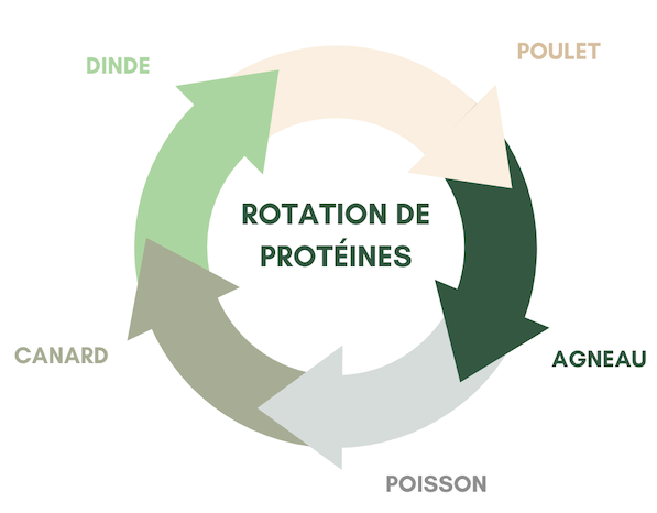 La rotation des protéines consiste à varier régulièrement les sources de protéines (poulet, bœuf, poisson, agneau, dinde, etc.).